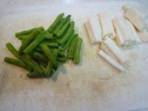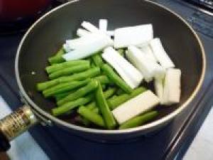 ![]() 長イモは皮をむいて、食べやすい大きさの拍子切りにします。いんげんは両端を少し切り落とし、3等分位に切ります。
