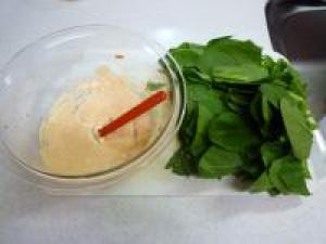 ![]() ほうれん草は洗って、茎を切り落として3等分位に切ります。和えダレはすべて一緒にして混ぜ合わせておきます。