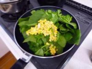 ![]() フライパンにほうれん草と、コーンを入れてから入りします。火がとおったら、いったん止めて冷まします。