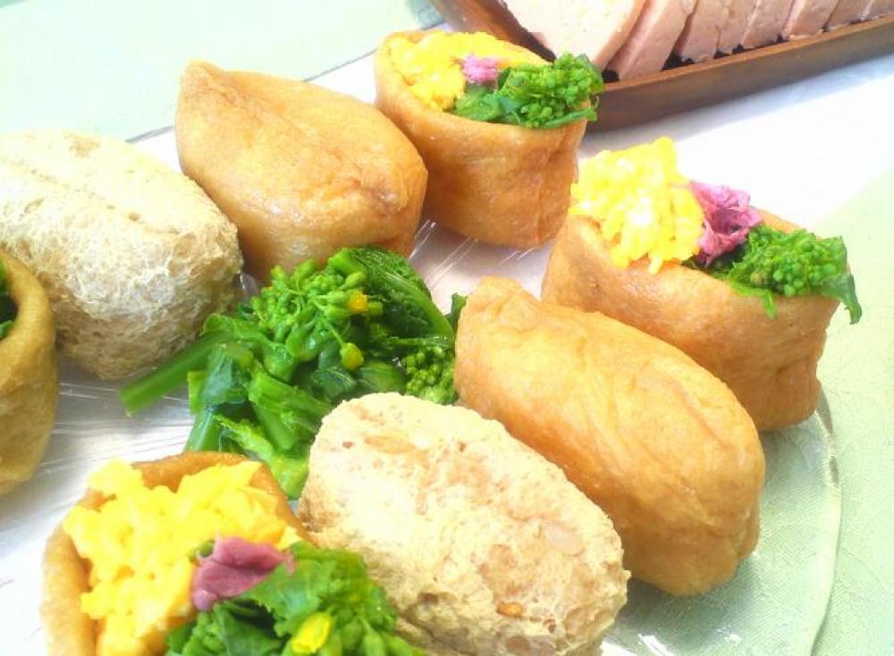 ![]() ⑤の油揚げの中に、16等分した①のすし飯を詰めていく。