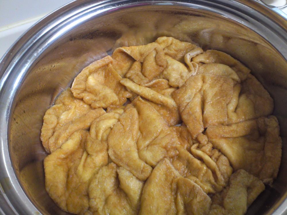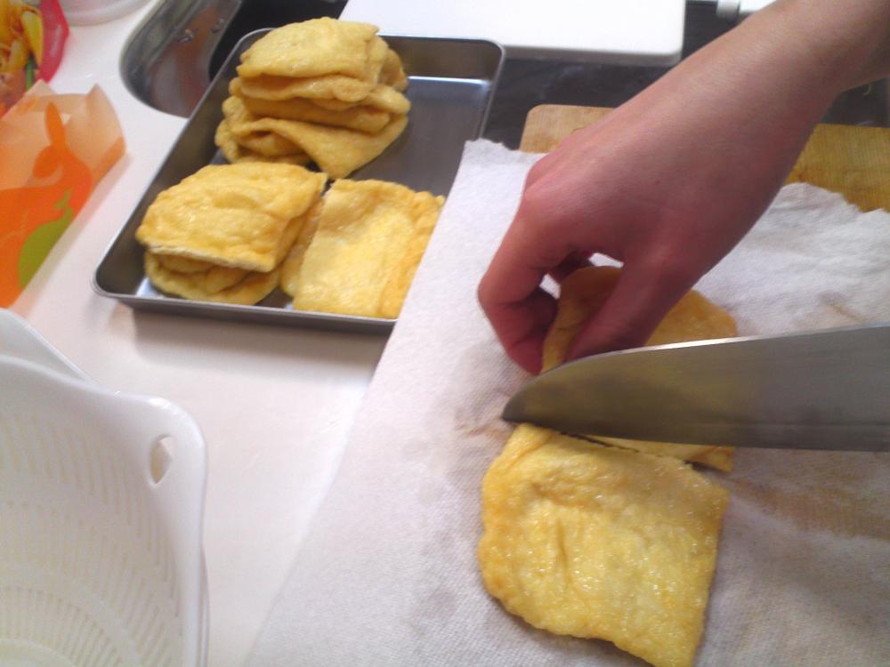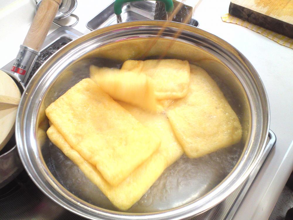 ![]() 鍋に湯を沸かし(油揚げがかぶる程度)②の油揚げを1分ゆがきザルにあげる。