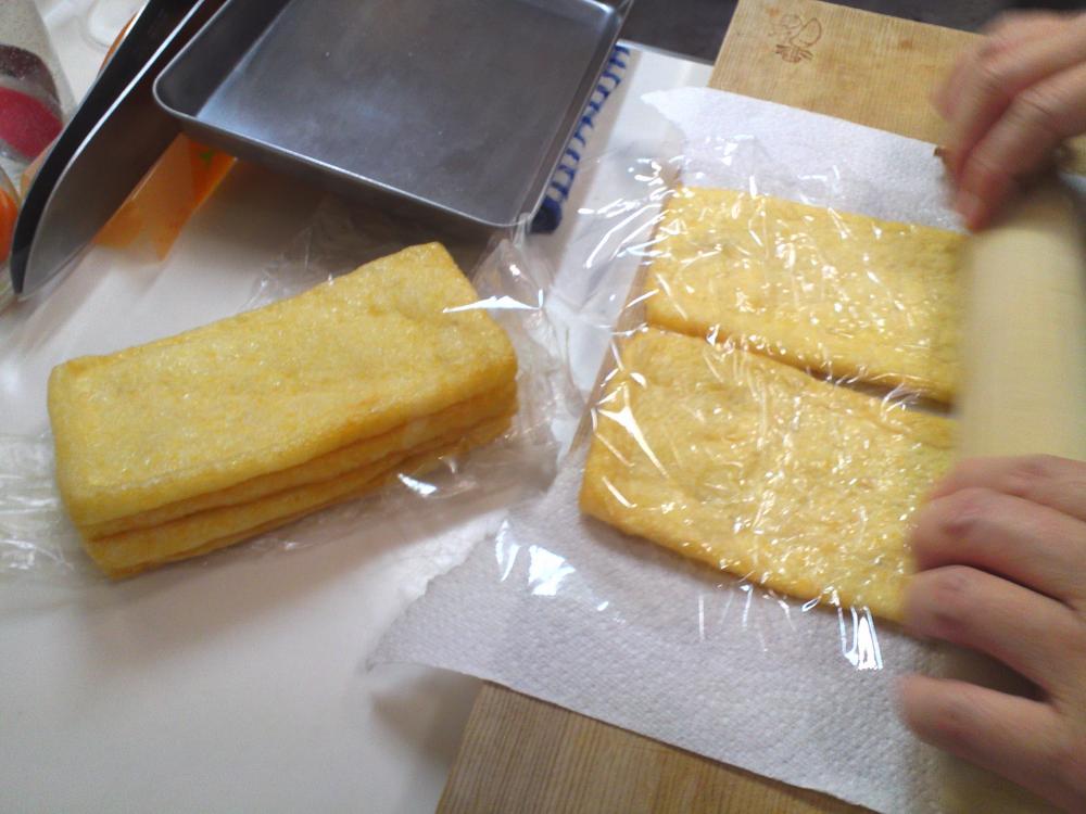 ![]() まな板の上にペーパーを敷いたら、油揚げを置きラップをかぶせる。上から綿棒や菜箸を転がし、ごはんを詰めやすくする。