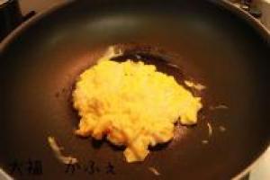 ![]() フライパンに油大さじ1をひいて、卵を半熟状にいためます。