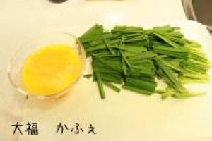 ![]() 卵はときほぐしておきます。ニラは洗って一口だいに切っておきます。