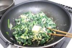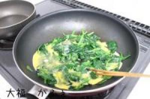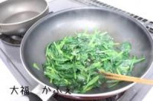 ![]() フライパンに油をいれ、ほうれん草をいためます。