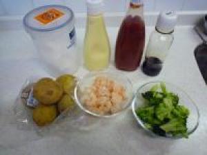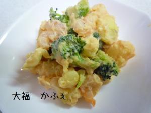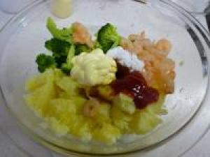 ![]() ボールにジャガイモを移して、粗目につぶします。そこへ、小エビ、ブロッコリー、残りの調味料をいれて混ぜ合わせたら完成です。