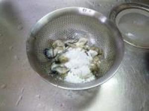 ![]() 牡蠣は分量外の片栗粉で洗って汚れを取り除きます。