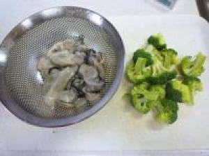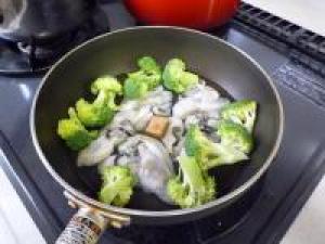 ![]() 鍋に水100cc、牡蠣、ブロッコリー、コンソメを入れて弱火~中火にかけます。