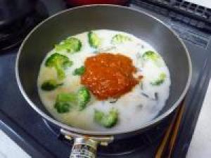 ![]() 牡蠣とブロッコリーに火がとおったら、牛乳、ミートソース、塩をいれます。
