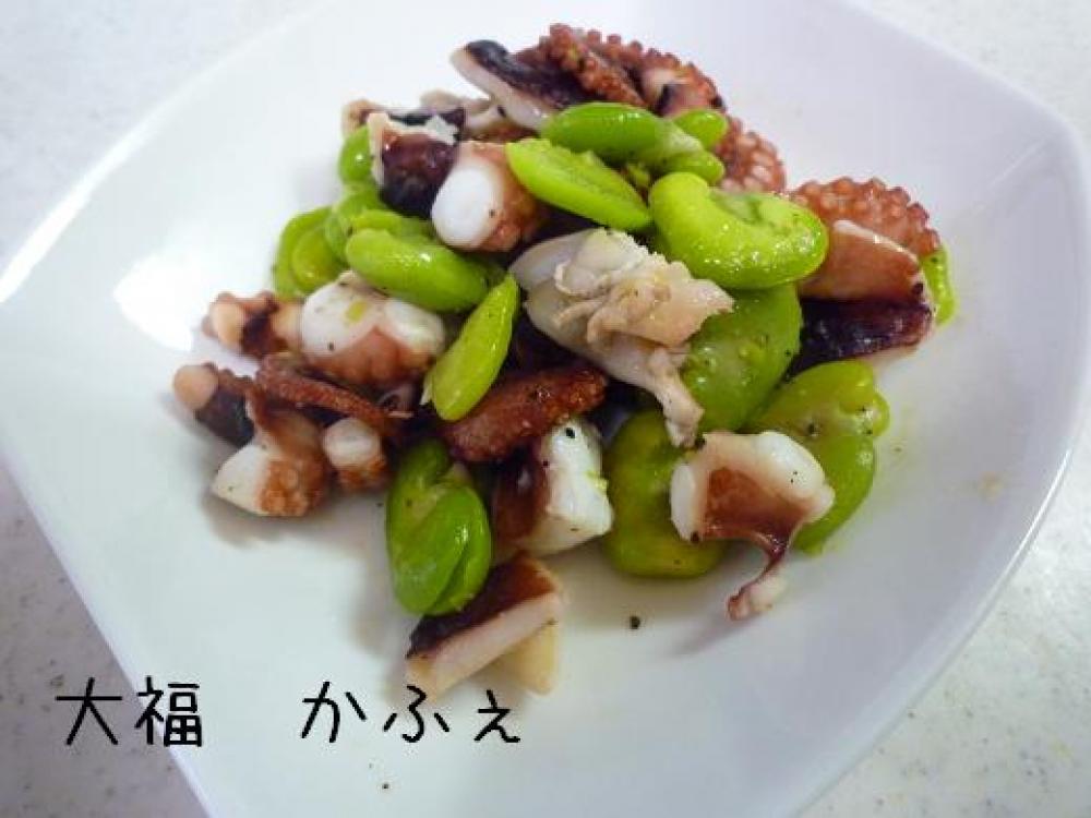 ![]() そら豆は解凍してさやから出します。タコは一口だいの大きさに切ります。