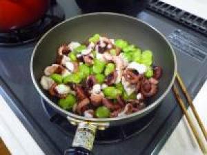 ![]() フライパンにオリーブオイルをひいて、火にかけタコとそら豆を炒めます。