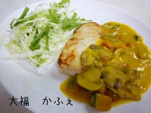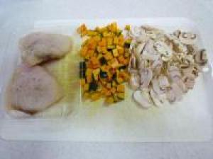 ![]() めかじきは塩、コショウをします。マッシュルームは薄切りに。かぼちゃは洗って、1センチ角くらいのサイコロ状に切ります。