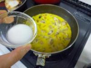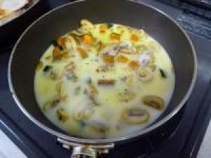 ![]() かぼちゃに火がとおったら、牛乳、コンソメ、塩一つまみ、コショウを入れます。