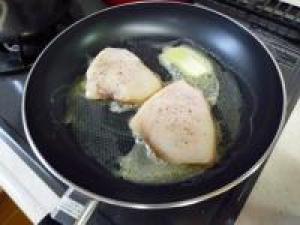 ![]() フライパンにバター10gを入れ、めかじきを両面ソテーしていきます。