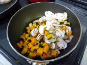![]() ソースをつくります。フライパンにバター10g、かぼちゃ、マッシュルームを入れていためていきます。