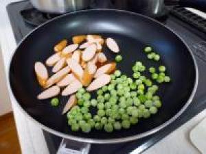![]() フライパンに油をひいて、ウインナー、グリンピースを炒めます。