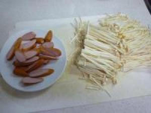![]() ウインナーは斜め切りに切ります、エノキは石づきの部分を切り落とします。