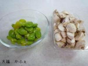 ![]() そら豆はひと茹でして皮をむきます。マッシュルームは食べやすい大きさにきります。