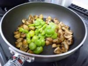![]() 油を引いてマッシュルームを炒めます。マッシュルームに火が通ったら、そら豆と塩を加えてひと炒め