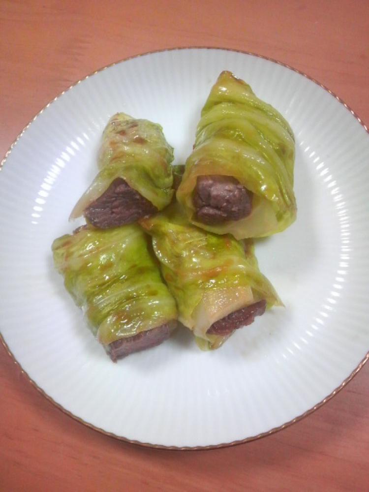 焼いた牛肉をキャベツで巻く。