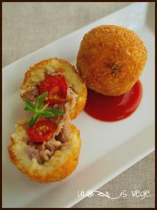 冷えたジャガイモでトマト肉巻きを包むようにして、すき間が出来ないようジャガイモで覆い丸くする。