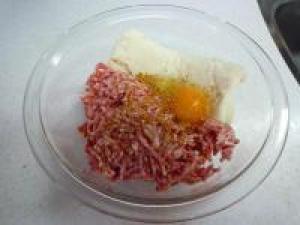 ![]() ボールに合いびき肉、生おから、卵、粉コンソメ、塩、コショウをいれてよくこねます。