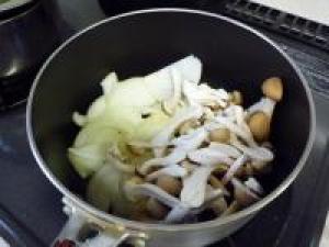 ![]() 鍋にバター、玉ねぎ、しめじを入れて炒めます。