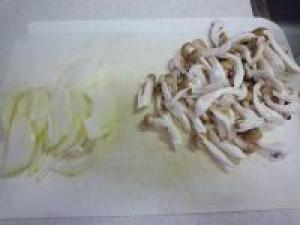 ![]() 玉ねぎは皮をとって、薄くスライスします。しめじはいしづきをとって食べやすい大きさに切ります。