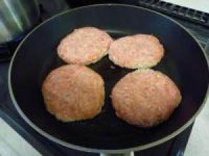 ![]() フライパンに油をひいて、ハンバーグの種をお好きな大きさに丸めて両目を焼いていきます。