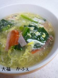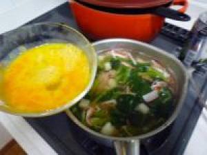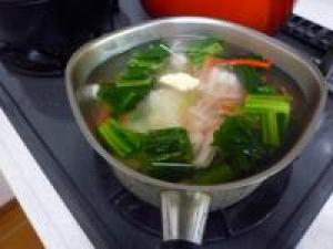 ![]() 鍋に水1リットル、鶏がらの素、カニカマ、小松菜、長イモを入れて火にかけます。