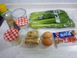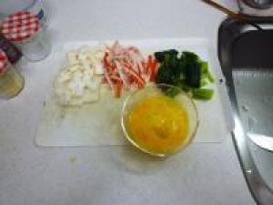 ![]() カニカマは食べやすい感じに縦に裂きます。小松菜は洗って、茎の部分を切り落としてざく切りにします。