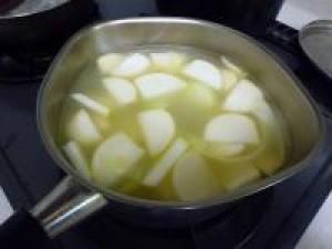 ![]() 鍋に水800cc、コンソメを入れて玉ねぎとかぶが柔らかくなるまで煮ます。