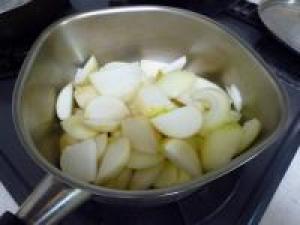 ![]() 鍋にバター、玉ねぎ、かぶをいれて玉ねぎが透き通るまで炒めていきます。