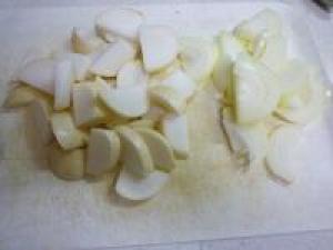 ![]() 玉ねぎは皮をむいて、芯の部分は切り落とし、薄切りにします。かぶは洗って、三日月切りにします。