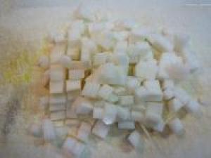 ![]() 大根は皮をむいて、1センチ角くらいのサイコロ状に切ります。