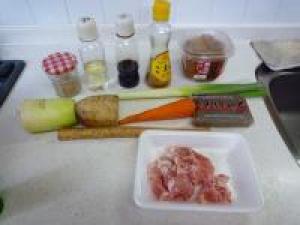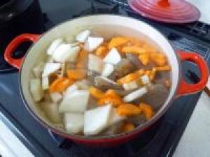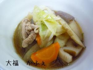 ![]() 豚肉・一口大に切ります。大根・皮をむいて、いちょう切りにします。人参・両端を切り落とし、皮をむいて半月切りにします。