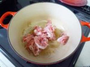 ![]() 大き目の鍋に、ごま油大さじ1をひいて豚肉をいためます。