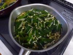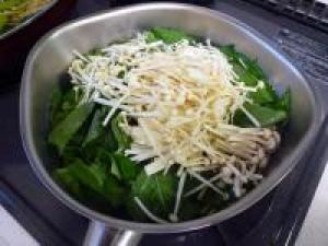 ![]() 鍋に水1リットル入れて、沸騰したらモロヘイヤとエノキを入れてにます。