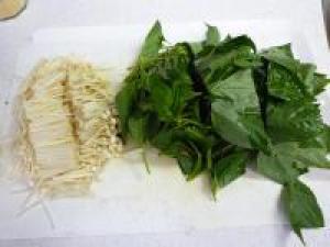 ![]() モロヘイヤは茎から葉を取り洗って3等分くらいに切ります。エノキはいしづきを切りおとして、2等分に切ります。