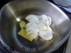 ![]() 鍋にバターを入れ、玉ねぎが透き通るまで焦げないように炒めます。