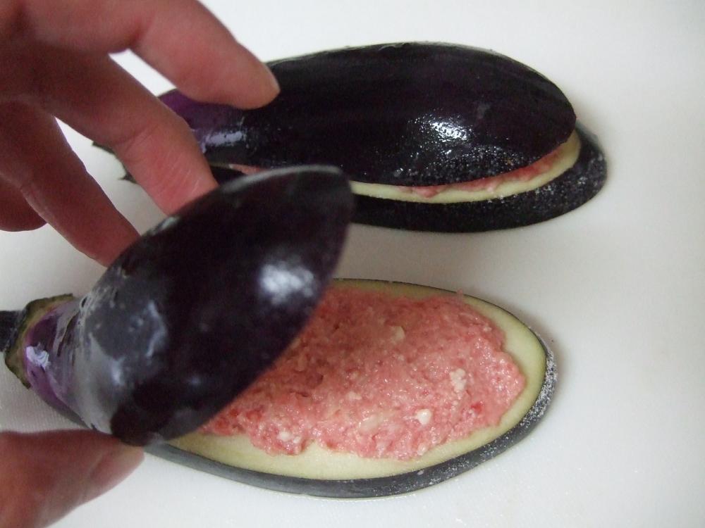 ![]() ナスは縦半分に切り、それぞれ切り込みをいれ、内側に小麦粉をふるう。等分したAを平らにしてはさむ。