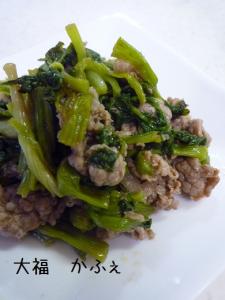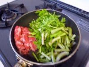 ![]() フライパンに油をひいて牛肉とせりを炒めます。