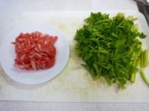 ![]() せりは洗って根の部分は切り落として食べやすい大きさに切ります。牛肉も食べやすい大きさに切ります。