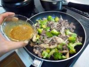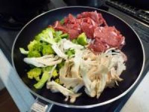 ![]() フライパンに油をひいて、牛肉、ブロッコリー、マイタケを炒めます。