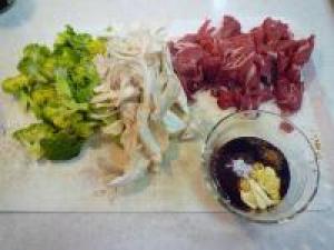 ![]() ブロッコリーは洗って、小さ目の一口大に切ります。牛肉、マイタケは食べやすい大きさに切ります。