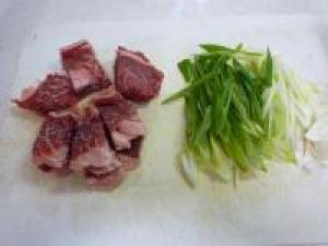 ![]() 牛肉は一口だいに切ります、長ネギは洗って斜め薄切りにします。