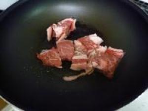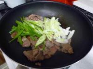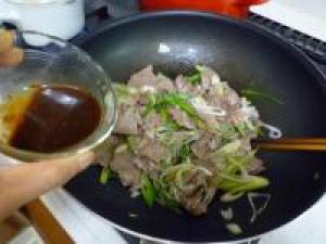 ![]() 牛肉に火がとおったら、長ネギを入れて炒め合わせます。
