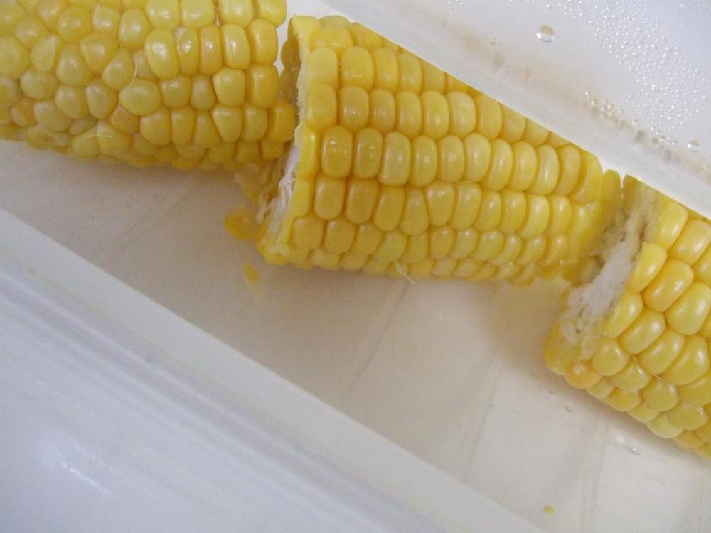 ![]() シリコンスチーマーに入れ、レンジ600W2分。とうもろこしの上下ひっくり返して、さらに1分くらい。