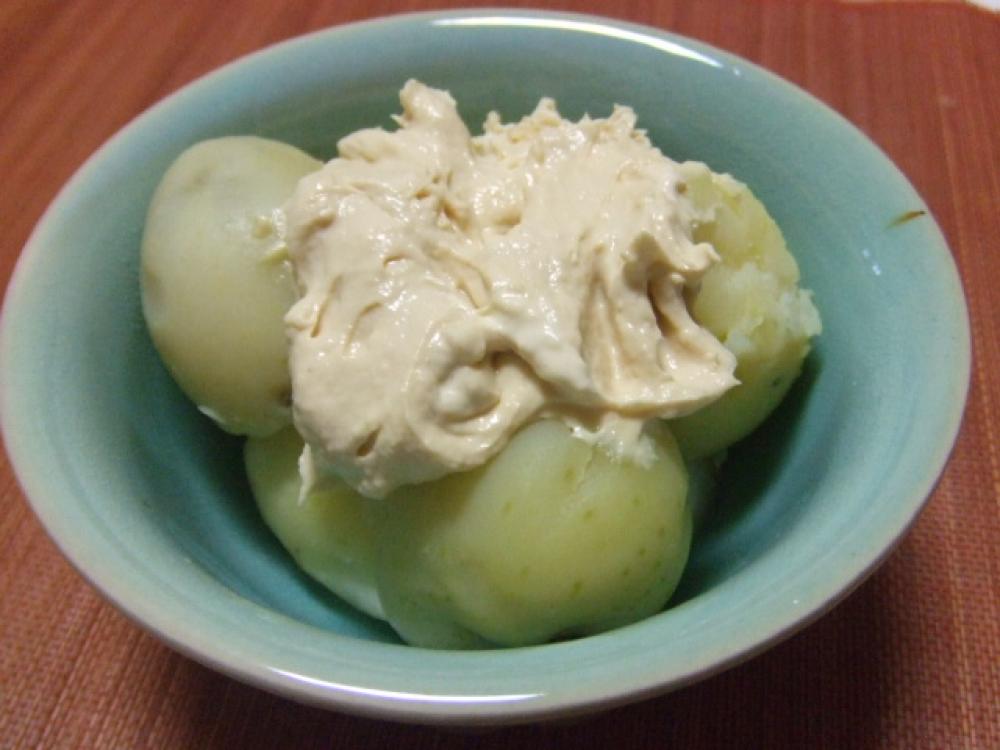 じゃがいもはよく洗い、皮のまま蒸し器で柔らかくなるまで蒸し、皮をむいて半分に切る。