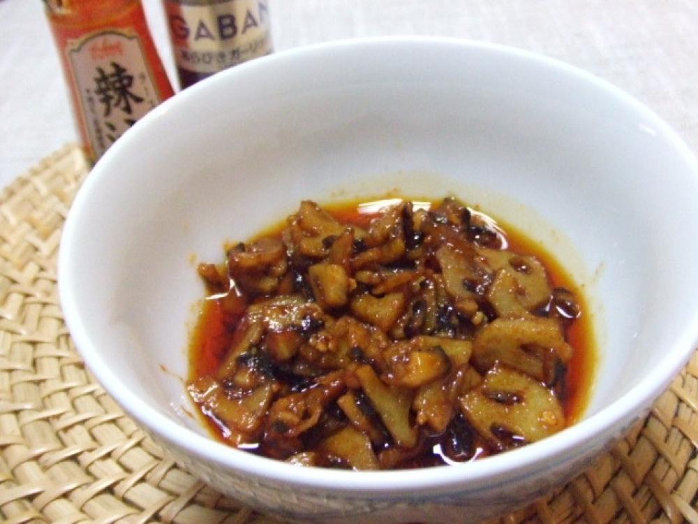 ![]() フライパンにサラダ油・ラー油・ゴマ油を入れ、熱くなったらレンコン・しいたけ・あらびきガーリックを入れ炒める。